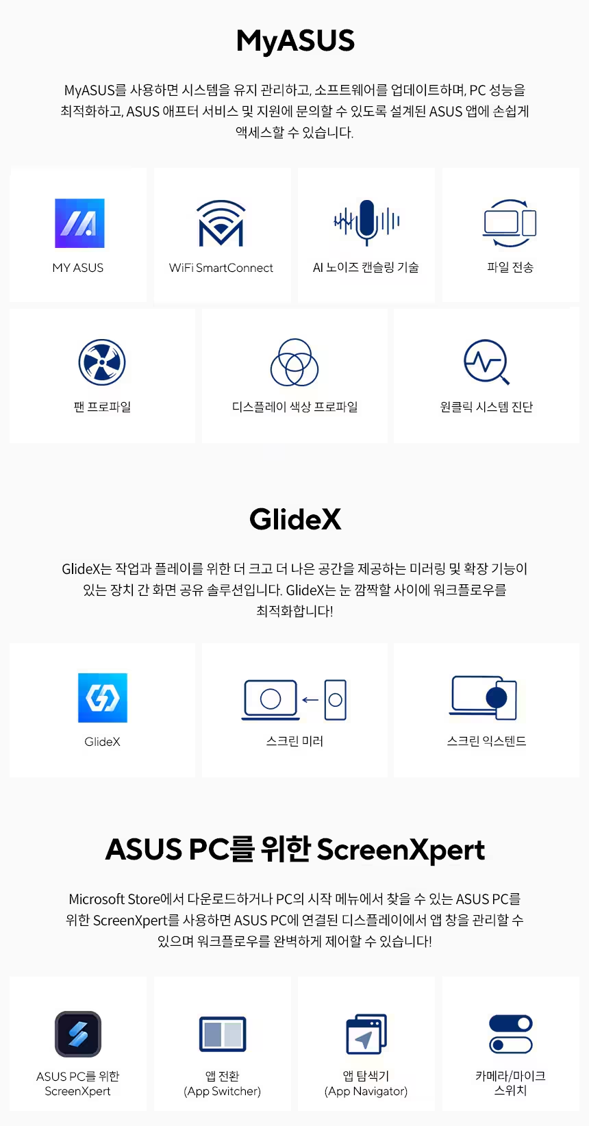 | 기본 소프트웨어 | MyASUS ScreenXpert GlideX |