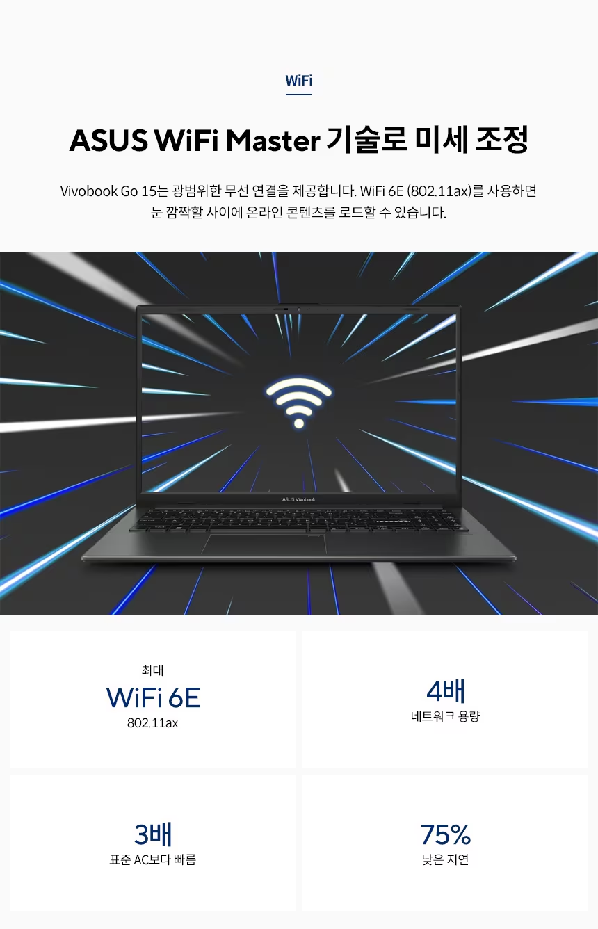| 네트워크 | Wi-Fi 6E(802.11ax) (Triple band) 1*1 + Bluetooth® 5.3 Wireless Card (*Bluetooth® version may change with OS version different.) |