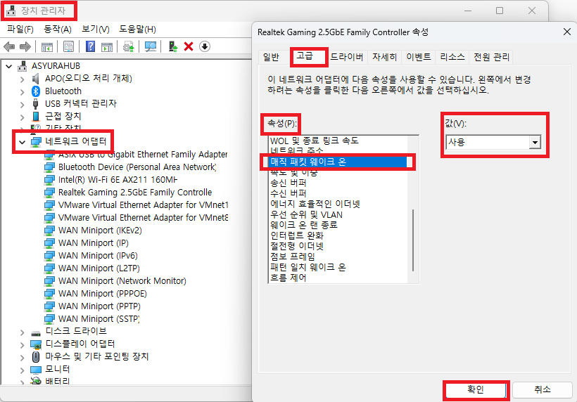 보통 BIOS에서 WOL 설정하면 된다고 알고들 계신데, 윈도우 네트워크 드라이버에서도 설정해줘야 합니다.