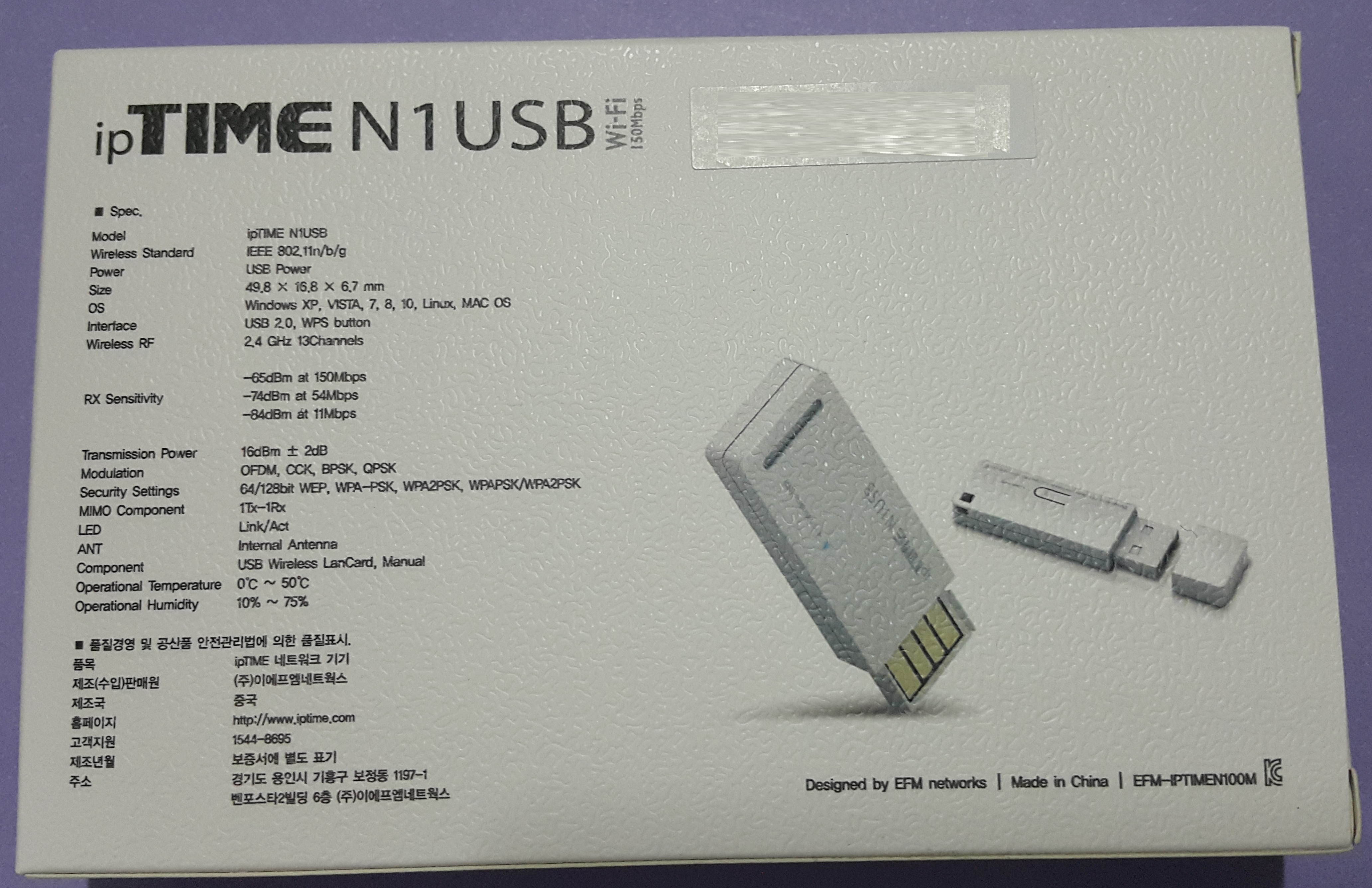 크기는 USB 정도로 매우 작은 무선랜카드이며 최대 속도는 150Mbps 이기 때문에 일반적인 웹서핑이나 유투브 감상하는데는 충분합니다.